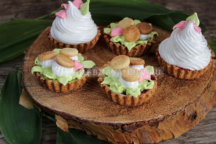 После этого оформите десерты: сначала положите джем, затем украсьте белковым кремом. По желанию часть крема можно окрасить в различные цвета, чтобы придать десерту яркость. Оставьте в холодильнике минимум на час и наслаждайтесь десертом в компании друзей или семьи!