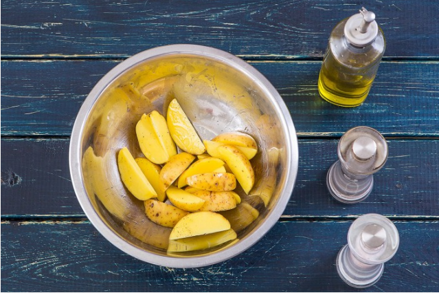 1. Подготовка картофеля: Разогрейте духовку до 200 °C. Картофель тщательно промойте, нарежьте на дольки, приправьте солью и перцем, полейте оливковым маслом.