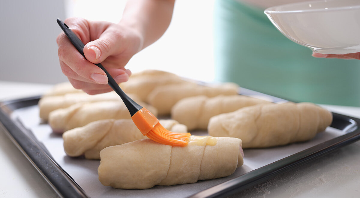 - Наносить яичную смесь кисточкой для равномерного распределения.