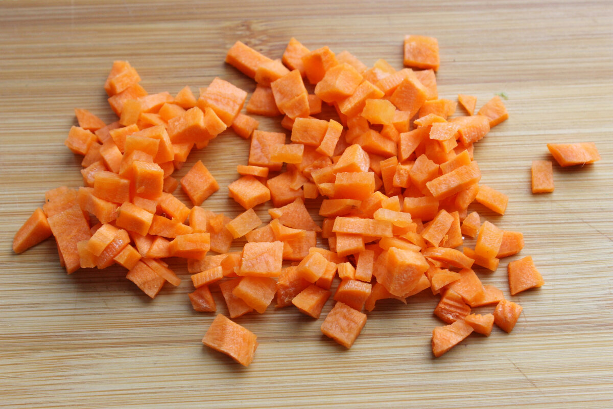 Приготовьте суп, начиная с моркови — нарежьте её мелкими кубиками. Как только бульон закипит, добавьте морковь, а после этого картофель и лук, также нарезанные мелко. Затем, когда всё закипит, добавьте макароны, которые за это время увеличатся в размере дважды.