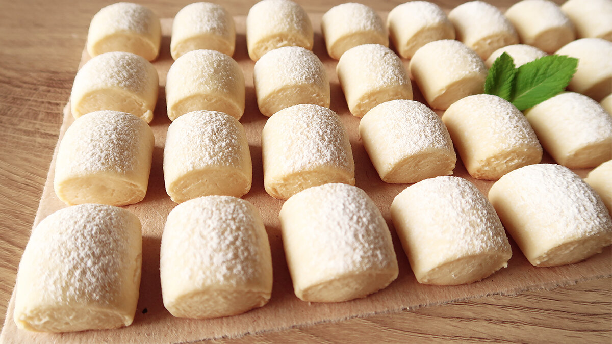 После охлаждения разделите тесто на четыре части. Каждую часть раскатайте в тонкий жгут и нарежьте на кусочки по 3,5 см. Выложите их на противень, не забывая предварительно разогреть духовку до 180 градусов.