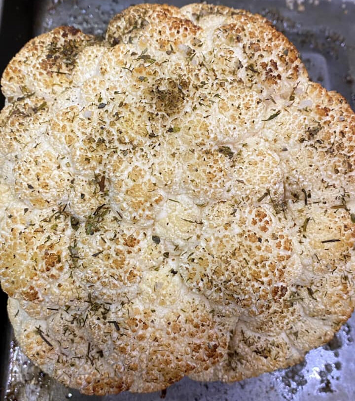 Перед тем как отправиться в духовку, необходимо правильно подготовить цветную капусту. Сначала срежьте нижнюю часть кочерыжки, чтобы овощ смог устойчиво стоять на противне. Удалите все зеленые листья. Затем капусту следует замочить в холодной подсоленной воде (1 ст. л. соли на литр воды) на 20–30 минут. Это поможет удалить насекомых и сделает соцветия более солеными.