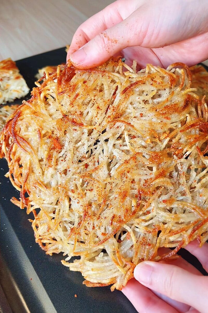 В другой сковороде разогрейте стакан растительного масла до температуры 175–190°C. После этого осторожно перенесите картофельный блинчик на сковороду вместе с пергаментом и жарьте около 5 минут до золотистой корочки.