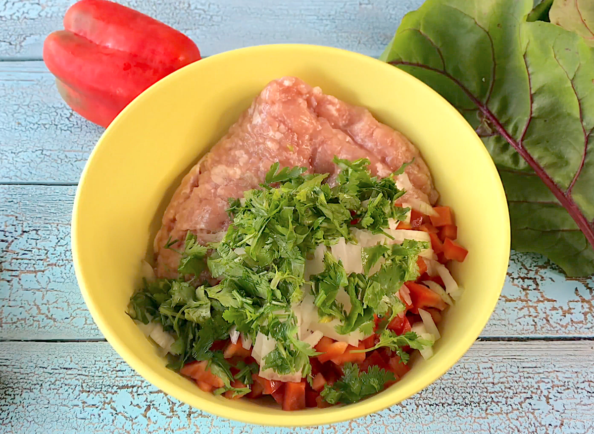 Первым шагом необходимо подготовить начинку для голубцов. Мясо (лучше всего использовать куриное филе) прокручивается через мясорубку, после чего добавляются мелко нарезанные лук, болгарский перец и кинза. В смесь вводятся специи и соль по вкусу, все тщательно перемешивается. Для более сытного варианта можно добавить немного отварного риса.