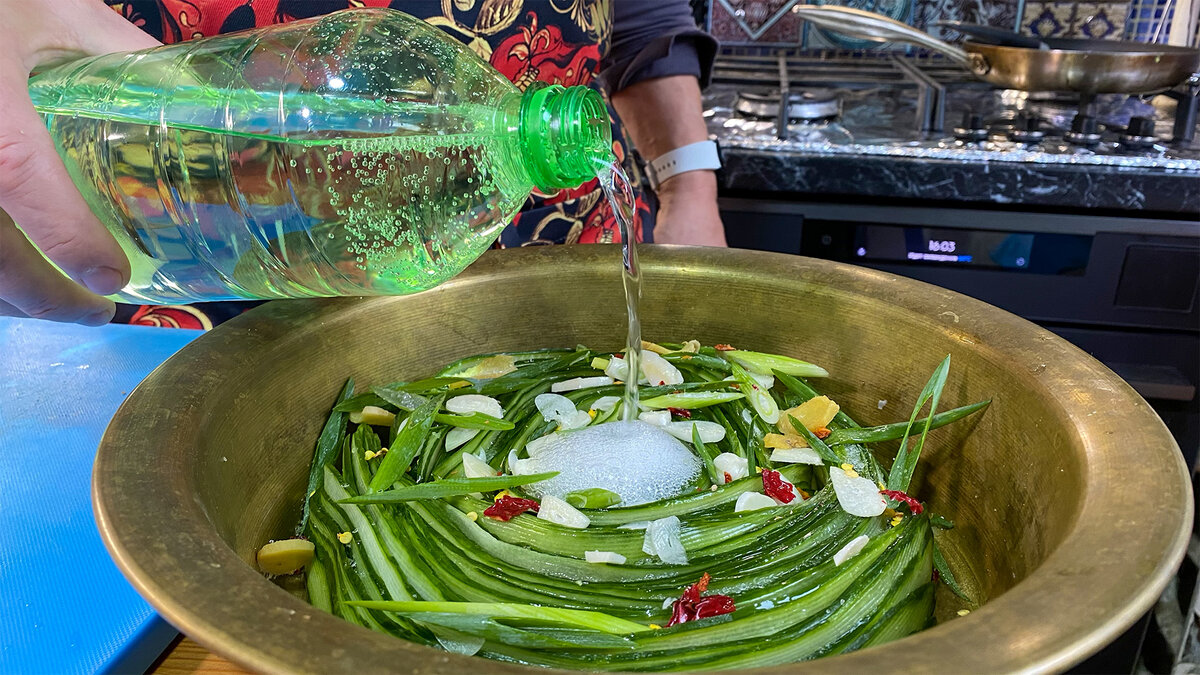 Сначала огурцы следует нарезать на тонкие и длинные слайсы с помощью овощерезки. Затем аккуратно складывают их в глубокую миску. Чеснок, имбирь и острый перец нарезаются мелкими кусочками и посыпаются сверху на огурцы. После этого, огурцы щедро посыпаются солью и поливаются Спрайтом.