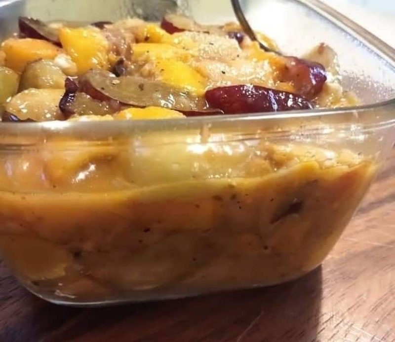 К яблокам добавляют мелко нарезанные сливу, персик, киви, а также чеснок и имбирь. Все перемешивают и прогревают не дольше одной минуты, а затем снимают с огня.