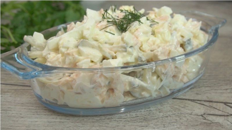 Теперь можно собирать салат: в глубокой миске объедините рыбу, огурцы, яйца, тонко нарезанный лук (можно использовать овощечистку для удобства). По желанию добавьте укроп, если не все члены семьи его приветствуют, можно обойтись без него. Заправьте салат майонезом, и он готов к подаче!