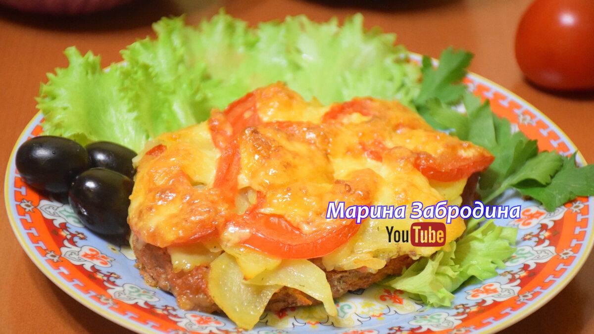 6. Накройте противень слоями: сначала мясо, затем лук, картофель, помидоры, сверху сыр. Выпекайте в разогретой до 180 градусов духовке около 50-55 минут. Приятного аппетита!