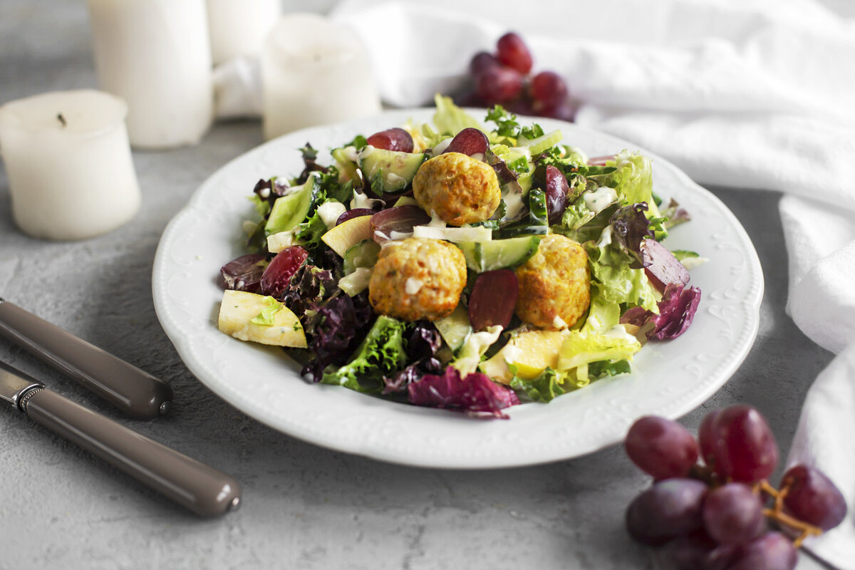 Шаг 3: Пока готовятся польпетте, подготовьте свежие овощи. Огурцы нарежьте полукольцами, яблоки — дольками, а сельдерей — кольцами. Отделите виноград от ягод. В глубокой миске объедините все нарезанные ингредиенты, добавьте запечённые фрикадельки и заправьте соусом, приготовленным из йогурта, петрушки и горчицы. Посолите по вкусу и подавайте блюдо сразу.