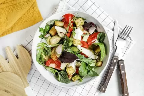 В универсуме кулинарии есть ингредиенты, которые способны преобразить любое блюдо — одним из таких является итальянский соус Песто. Эта зелёная магия идеально сочетается не только с пастой, но и с мясом, сэндвичами и особенно — с салатами. В сегодняшнем рецепте ароматный Песто станет звездой, придавая утонченность тёплому салату с курицей, сухариками и свежими овощами.
