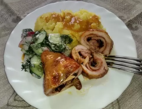 Затем каждый нашинкованный кусок обильно приправить солью, чёрным молотым перцем и паприкой. На мясо укладывается пропущенный через чеснокодавку чеснок, чернослив и бекон. Чернослив можно использовать как в целиком, так и нарезанным. Мясо сворачиваем аккуратными рулетиками.