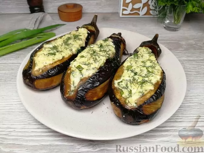 - Запечённые баклажаны с творожной начинкой — легко готовятся и радуют вкусом. Готовя этот рецепт, можно не переживать о лишнем масле, так как запекание не требует обжаривания.