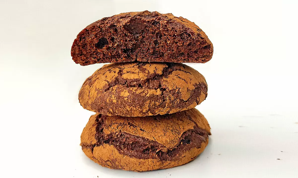 Далее на плоскую тарелку высыпают ложку какао и обваливают в нем тесто, аккуратно формируя шарик и придавая ему плоскую форму. Печенье выкладывается на специальный коврик для выпечки и ставится в заранее разогретую духовку до 180 градусов, где будет готовиться около 15 минут.