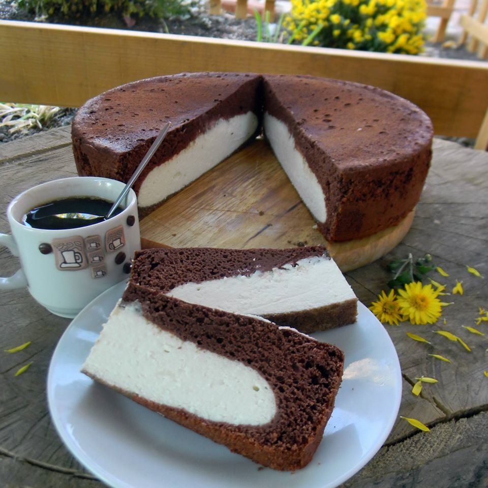 Аккуратно выкладывать творожное тесто в центр шоколадного, добиваясь равномерного распределения. Установить режим "выпечка" на 65 минут. По истечении времени аккуратно перевернуть чашу и удалить кружок пергамента.