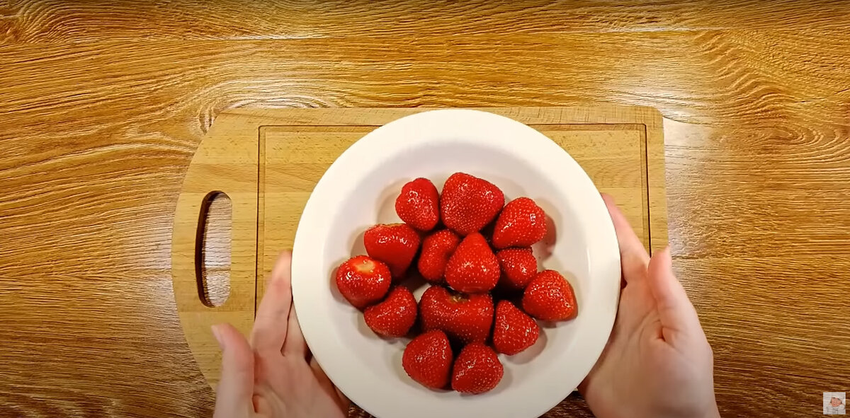 Первым делом клубнику необходимо тщательно помыть, а затем нарезать на небольшие кусочки. После этого фрукты следует заморозить; для этого их стоит отправить в морозильник на два часа.