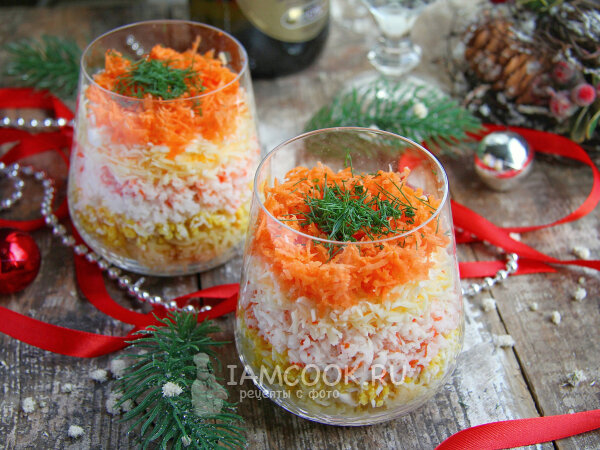 - Салат «Бархатный» с крабовыми палочками — простота в приготовлении и великолепный результат! Этот салат станет незаменимым на любом праздник. Необходимые ингредиенты: картофель, крабовые палочки, твердый сыр, морковь, яйцо и майонез. Легкость и свежесть делают его идеальным выбором для новогоднего стола.