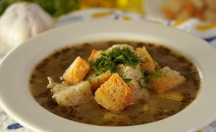 - Подаем суп с хрустящими сухариками и посыпаем свежим укропом для аромата.