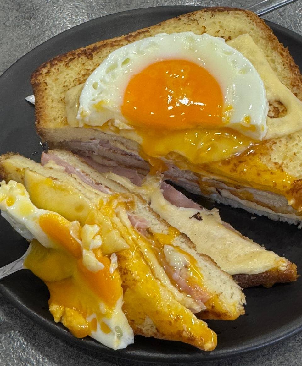 В завершение блюда нужно обжарить яйца-глазунью и аккуратно выложить их на готовый сэндвич. Подавайте горячим, наслаждаясь хрустящей корочкой, расплавленным сыром и мягким яйцом сверху – это настоящий праздник для гурманов!