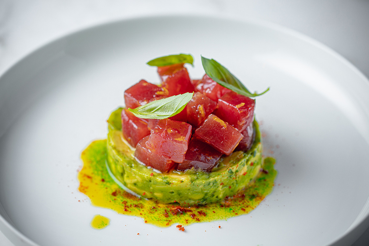Ресторан предлагает широкий выбор сырых блюд: крудо, тартар и севиче, а также горячие закуски, такие как черная треска мисо и пельмени из дальневосточной рыбы с икрой.