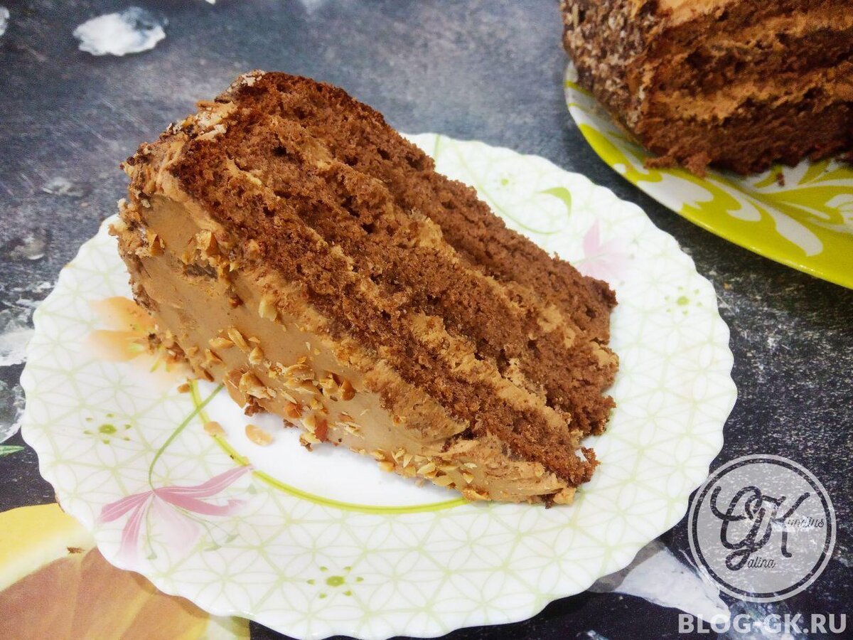 Для пропитки, сварите крепкий кофе с добавлением сахара и коньяка (по желанию). Коржи пропитайте, используйте крем для сборки торта. Обсыпьте поверхность тертым шоколадом и измельченными орехами. Дайте настояться в холодильнике на ночь.