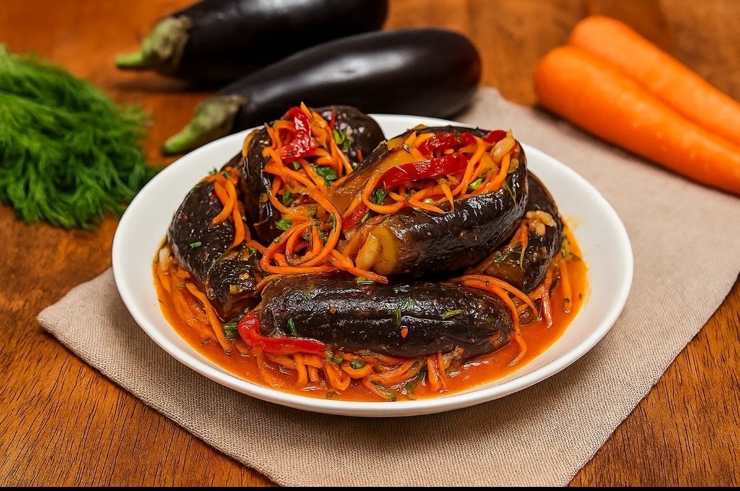 Эта закуска из фаршированных баклажанов по-корейски привлекает внимание своей остротой и необычным вкусом. Быстро исчезает со стола и становится любимой среди гостей.