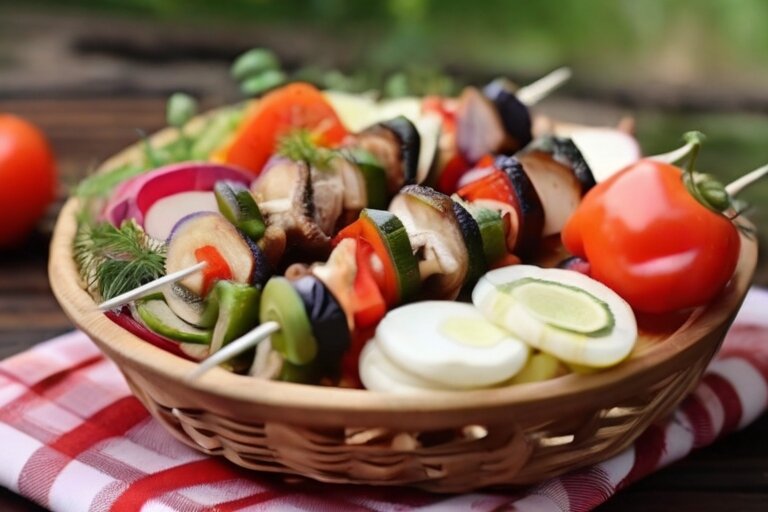 Этот вегетарианский шашлык – идеальный выбор для ценителей овощей. Сочные продукты, маринованные до совершенства, в сочетании с нежными грибами создают отличный вкус и аромат.