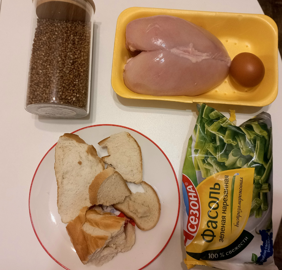 Всё начинается с варки чечевицы для супа и гречки. Чтобы увеличить количество клетчатки в рационе, добавляется зелёная фасоль. Параллельно подготавливается куриное филе, которое затем отварится с луком. В то время как бульон варится, филе нарезается на кусочки для будущих нагетсов, которые остаются мариноваться в холодильнике до вечера.