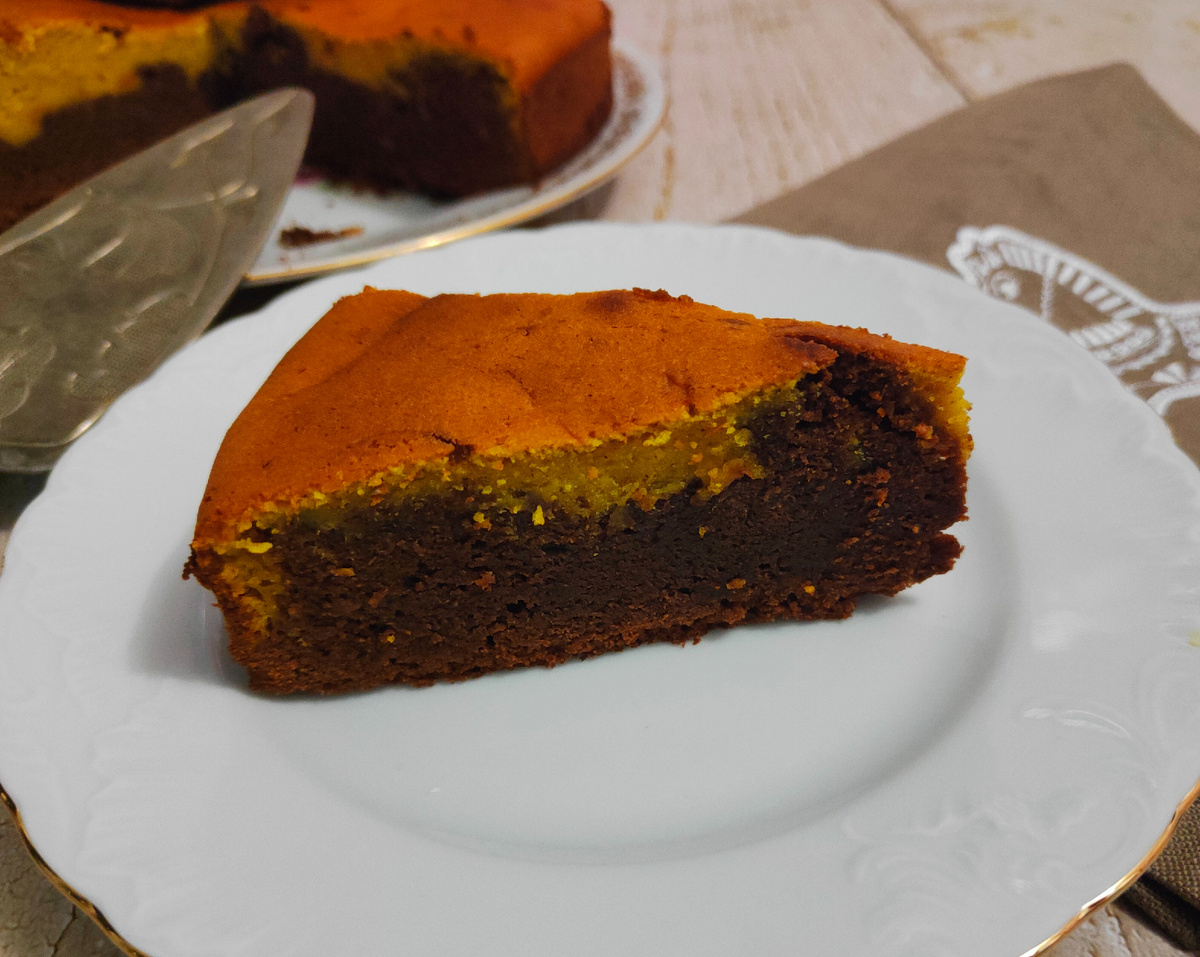 В заранее подготовленную форму вылейте шоколадное тесто, равномерно распределите его по дну, затем добавьте тыквенное и слегка перемешайте слои.