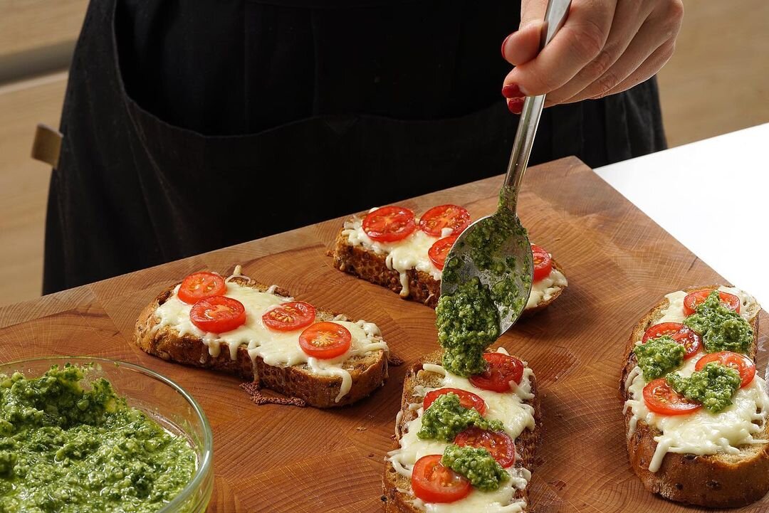 Листья базилика аккуратно отделить от стеблей.В чашу блендера положить листья базилика, чеснок и кедровые орехи, измельчая до получения однородной массы.Продолжая смешивать, постепенно влить оливковое масло.Добавить тертый пармезан и довести до однородности, после чего внести сок лимона, соль и перец по вкусу. Готовый соус можно хранить в холодильнике до двух недель.Помидоры черри нарезать тонкими колечками, а моцареллу натереть на крупной терке.Кусочки хлеба смазать размягчённым сливочным маслом с обеих сторон и обжарить в сковороде по 2 минуты с каждой стороны.На поджаренную сторону выложить тертую моцареллу и ломтики помидоров, накрыть крышкой и жарить на минимальном огне 4-5 минут, пока сыр не расплавится.В завершение добавить соус песто сверху и подавать горячими.