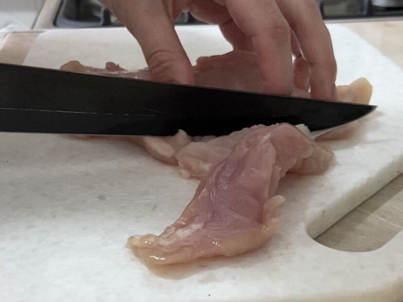 Для начала нужно подготовить куриную грудку. Отделите малое филе, не спешите его убирать, оно пригодится позже. Затем аккуратно сделайте надрез вдоль, формируя «кармашек».