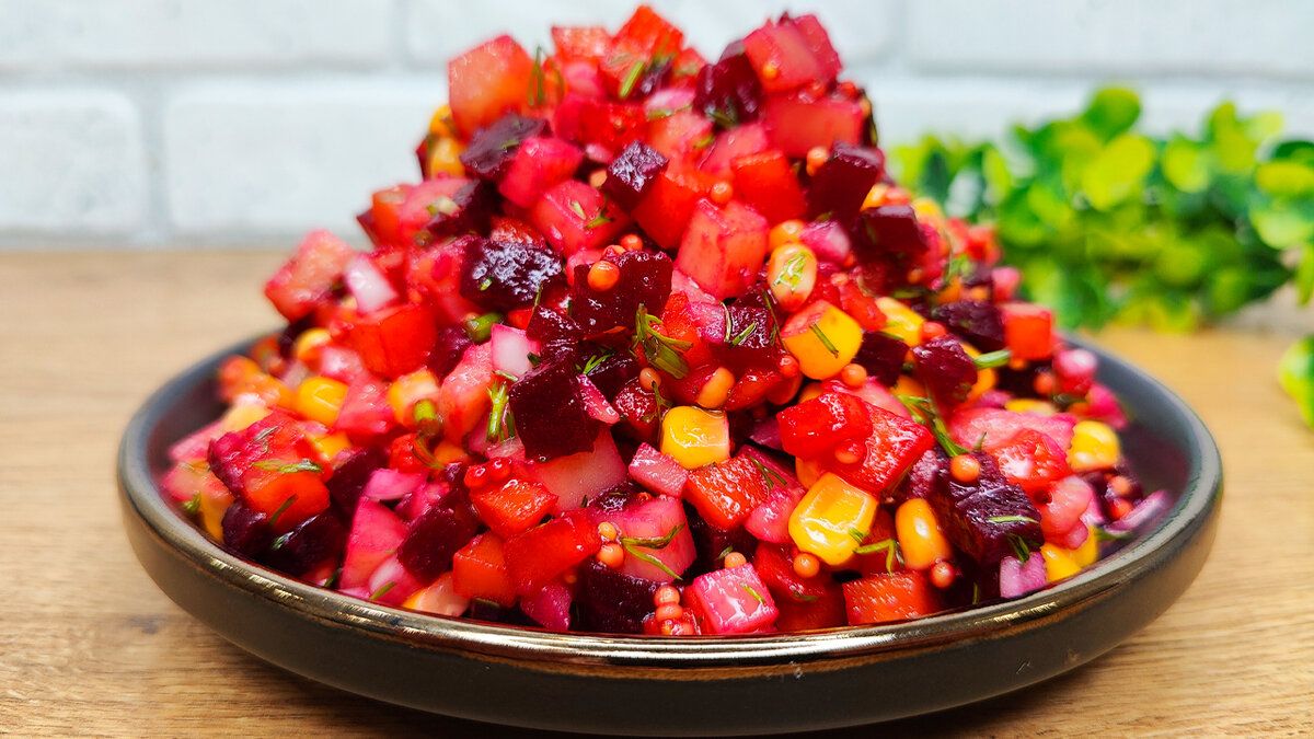 Салат напоминает классический винегрет — его основа состоит из простых отварных овощей, всегда под рукой. Однако благодаря нескольким ключевым ингредиентам он обретает вполне оригинальный вкус. Сладкая кукуруза, свежий укроп и запоминающаяся заправка с зернистой горчицей делают его многогранным и немного пикантным.