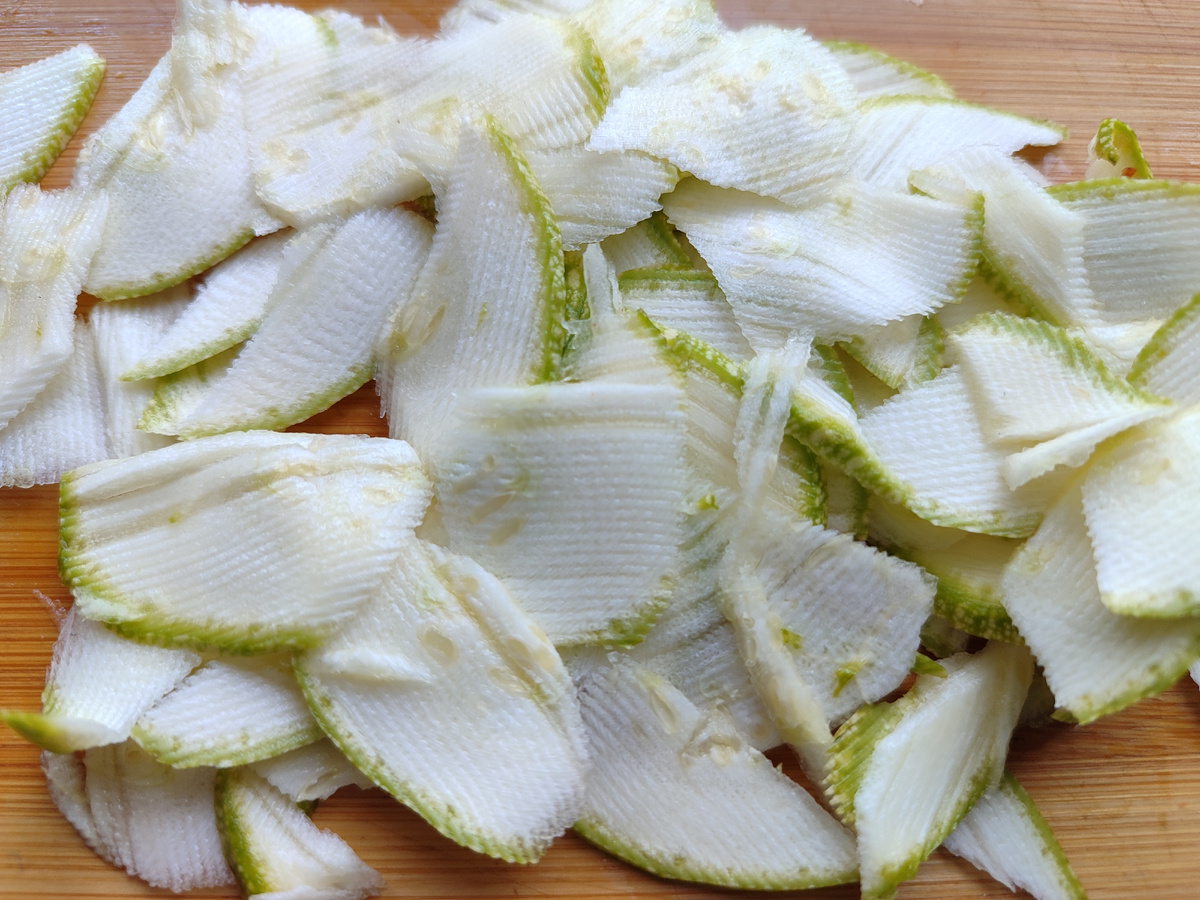 2. Обработка овощей: нарежьте кабачок, морковь и картофель тонкими ломтиками. Важно, чтобы все овощи имели одинаковую толщину для равномерного приготовления.