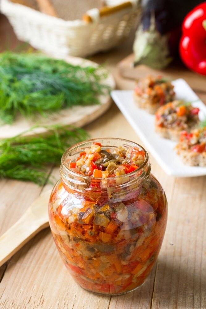 Консервация: Разложите готовую закуску по стерилизованным банкам и закатайте плотно крышками.