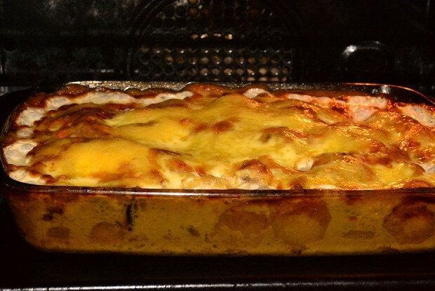 Формируем наш шедевр! На противень выкладываем ингредиенты в следующем порядке: сначала слой картофеля, затем кусочки мяса, кольца лука и мелкую нарезку шампиньонов. В завершение все это щедро присыпаем тертым сыром и поливаем майонезом. Перекладываем противень в заранее разогретую духовку и запекаем до появления аппетитной золотистой корочки.