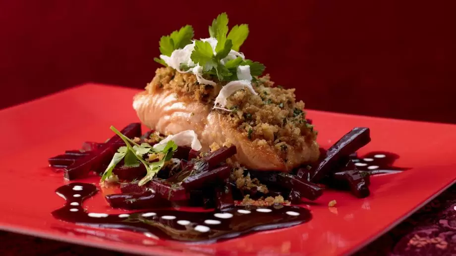 Запеченный лосось – это не просто вкусно, это настоящий гастрономический опыт! Это рыбное филе становится настоящей изюминкой как на праздничном столе, так и во время обычного семейного ужина. Сочетание нежного лосося с ярким свекольным соусом подарит невероятные вкусовые ощущения и украсит любое застолье.