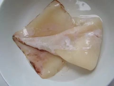 Приготовление кальмаров не займёт много времени и сил. Первым делом следует разморозить тушки кальмара, обдав их кипятком для облегчения снятия пленки. Затем, убрать внутренности и нарезать кальмары на кольца.