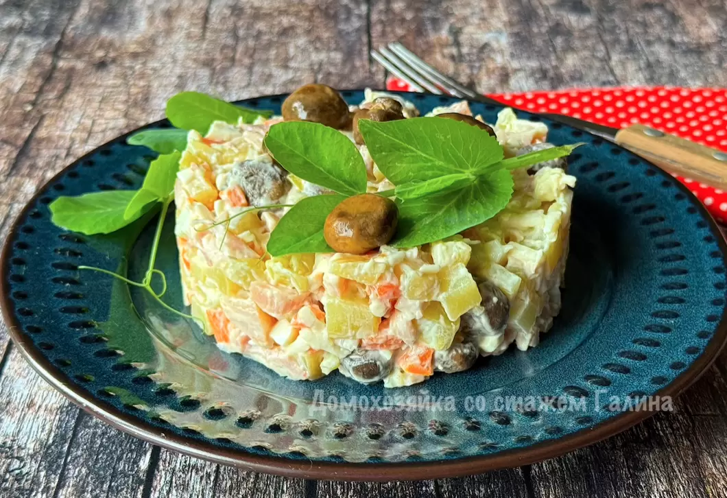 Салат изначально составлен из привычных продуктов: картофеля, моркови, куриного филе и других ингредиентов. Это созданный с любовью и заботой вариант, который всегда радует.
