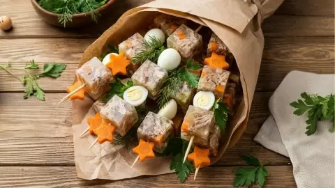 Финальный аккорд — холодец: создайте порционные заливные в форме звездочек, которые можно включить в общий букет, чтобы произвести восторг у зрителей.
