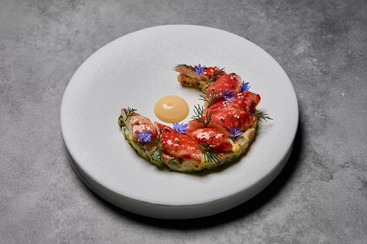 - Оливье с печеными овощами, камчатским крабом и домашним соусом на основе сладкого чили.