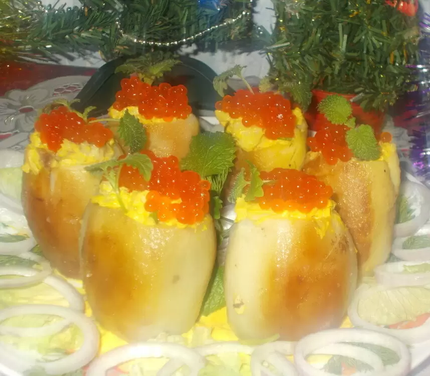 Теперь можно фаршировать полученной начинкой картофельные "пенечки". Украсить каждую из них красной икрой и добавить веточку мяты для изысканного финального штриха.