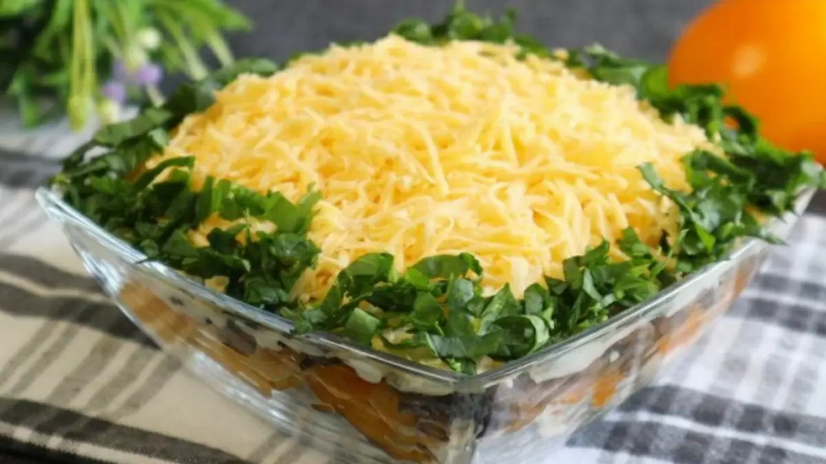 Завершает слоёное кулинарное произведение обильная посыпка тертым сыром, которая придаст вам невероятный вкус. Украсить свежей зеленью — и салат готов!