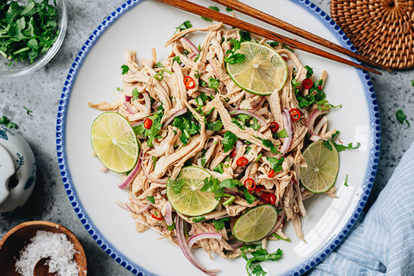 Затем следует смешать куриные волокна с натертым чесноком, нарезанным луком, соевым соусом, уксусом, соком лайма, сахаром, перцем и солью. В завершение добавляют кинзу и перец чили, тщательно перемешивают, пробуют на вкус и при необходимости досаливают. Подавайте салат с дольками лайма — это не только красивое, но и ароматное оформление.